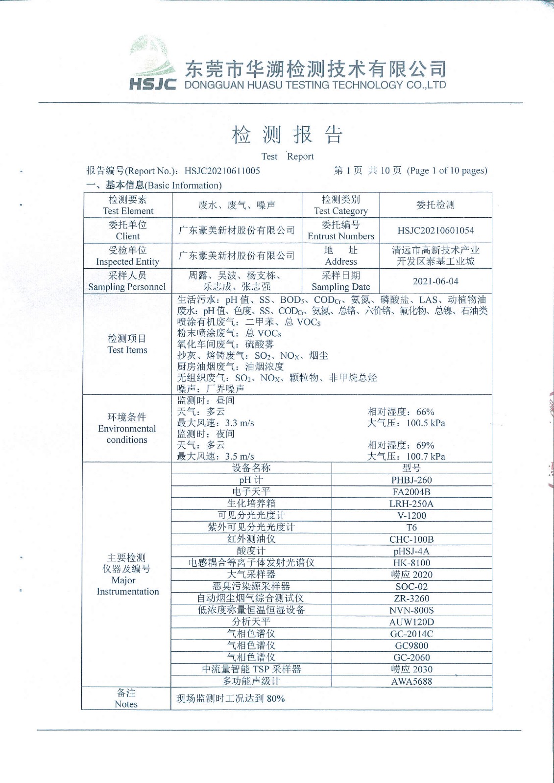 廣東豪美新材股份有限公司三廢檢測(cè)報(bào)告